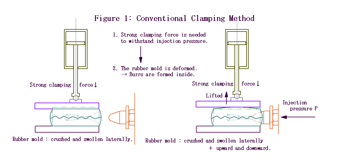 1. Large clamping force crushes a rubber mold and enlarges the slits in the mold.