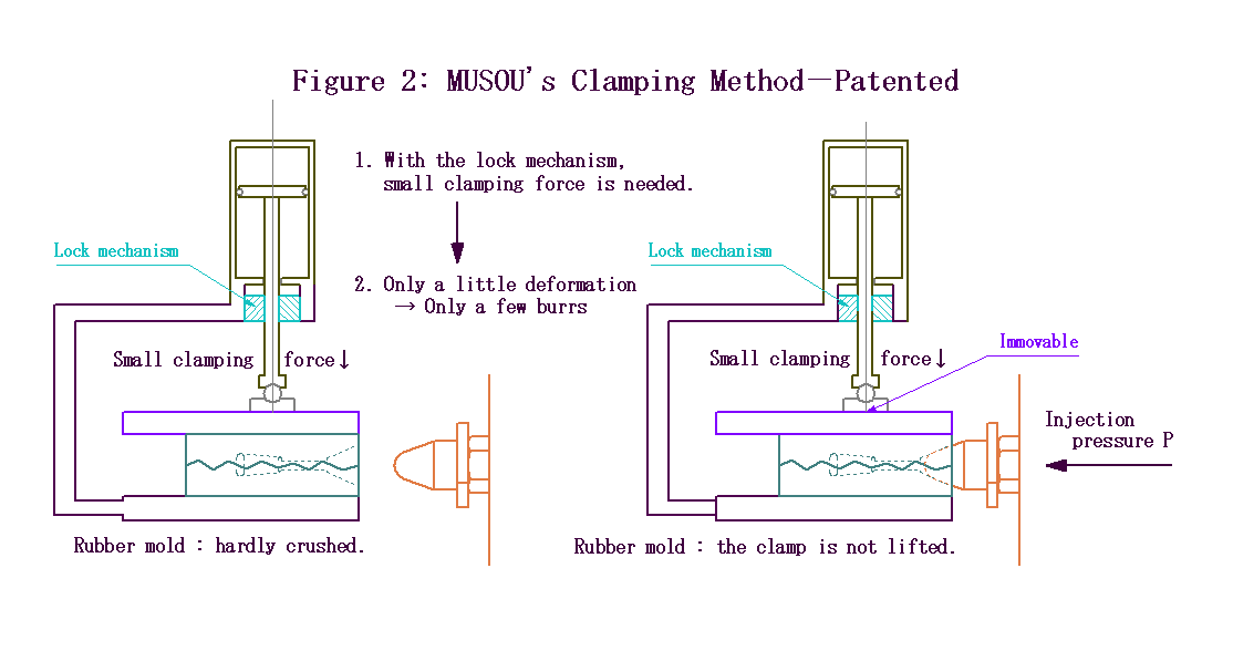 5. The lock mechanism of the clamp CYL enables a low clamp force to withstand the injection pressure, thereby preventing the rubber mold from being greatly deformed.