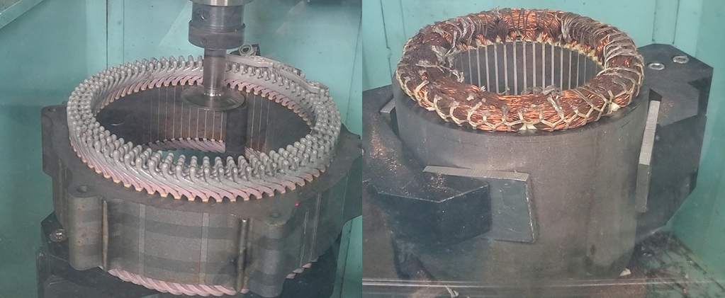 The machine for cutting copper wires for HV (EV) motors.